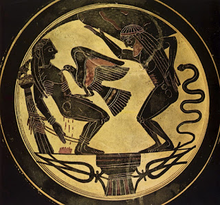 Celý alchymický proces o čtyřech agentech procházejících hlubokou proměnou skrze-sebe-navzájem lze podle mého názoru přirovnat k archetypu Dionýsa, který prochází tragicko-extatickou smrtí, roz-čtvrcením a znovuzrozením. (Kolem 5. st. před Kristem došlo k propojení obou kultů: egyptského Osirida a řeckého Dionýsa.)